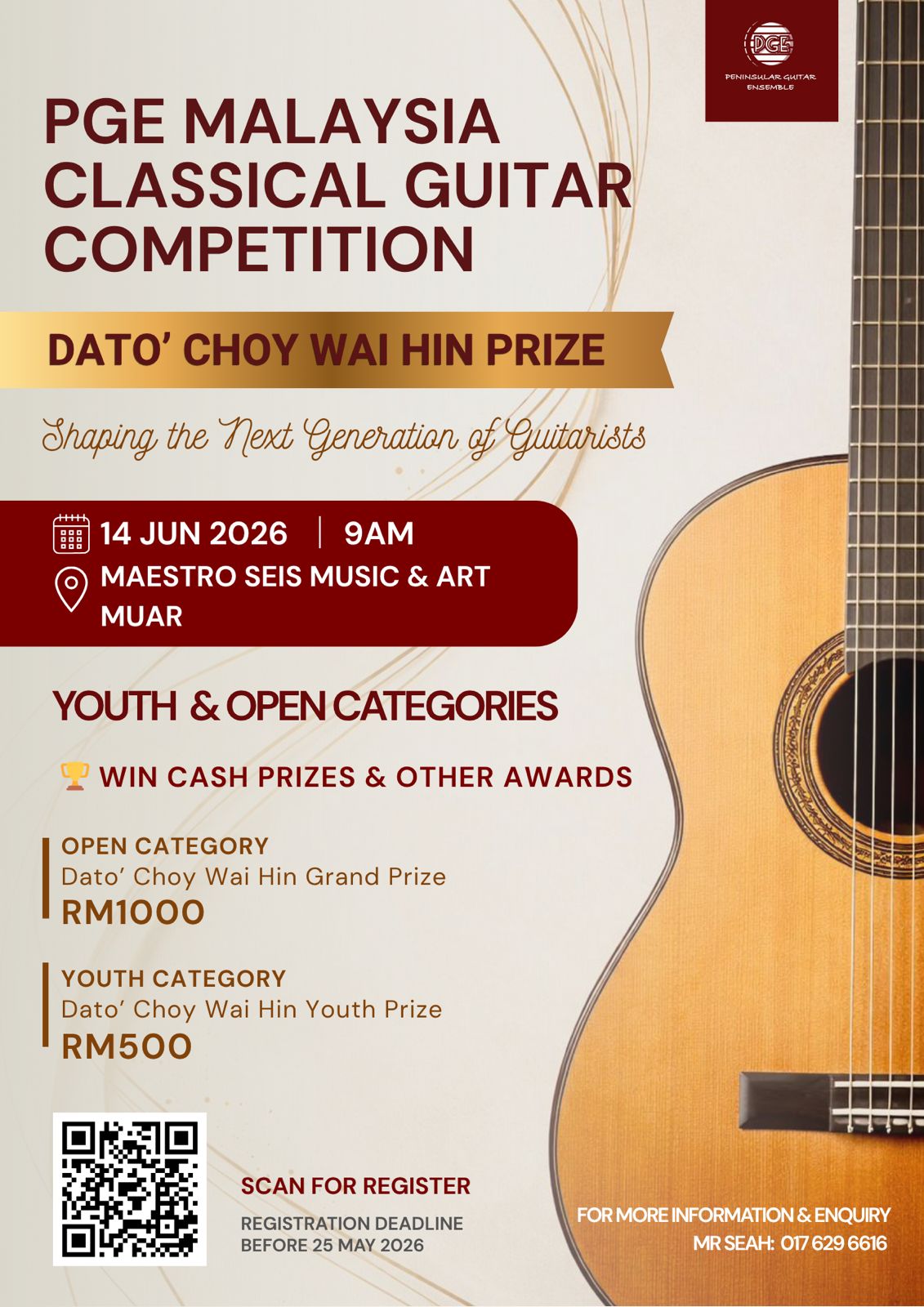 The PGE Malaysia Classical Guitar Competition, held as part of the festival and under the artistic direction of Ms Hong Tee, proudly presents a prestigious cash award — the Dato’ Choy Wai Hin Prize, named in honor of its generous sponsor. Dato’ Choy Wai Hin’s strong support and dedication to the local classical guitar community are widely recognized and deeply appreciated.